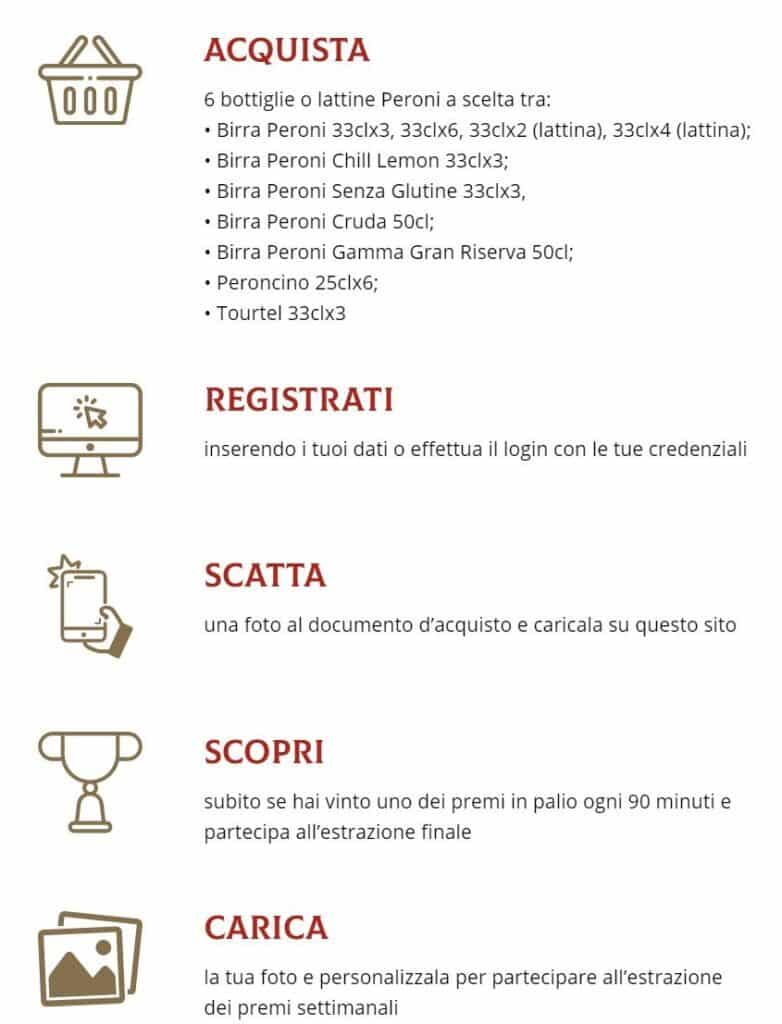 - Collegati alla pagina del concorso, registrati con i tuoi dati e carica la foto dello scontrino/documento di consegna. Seleziona dal menu a tendina i prodotti Peroni acquistati presenti nello scontrino.