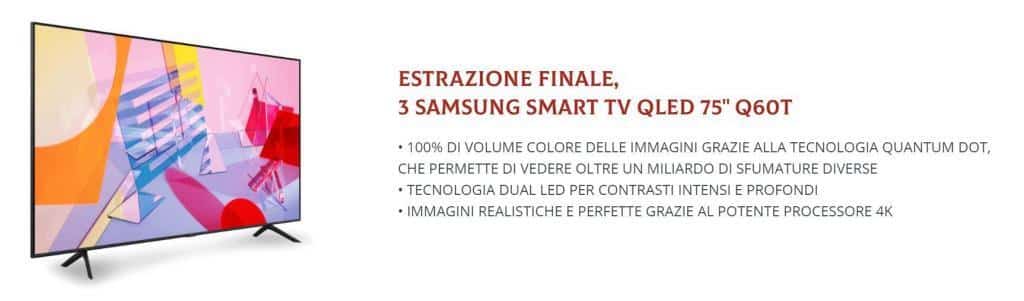 Al termine del periodo di validità dell’iniziativa si procederà con L’ESTRAZIONE FINALE in cui prenderai parte all’estrazione di 3 Smart Tv Samsung Qled 75”.