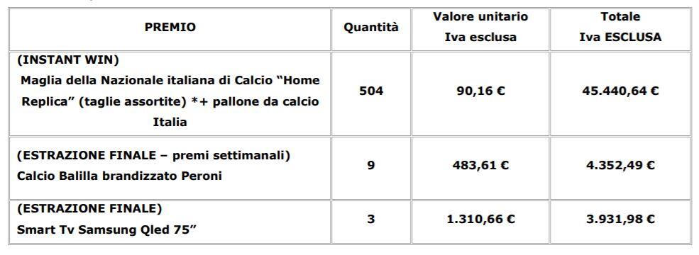Saranno pertanto individuati complessivamente 504 vincitori nell’intero periodo, che si aggiudicheranno ciascuno: la maglia della Nazionale italiana di Calcio “Home Replica”, del valore di € 90 iva inclusa + il pallone da calcio Italia, del valore di € 20 iva inclusa.